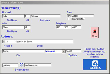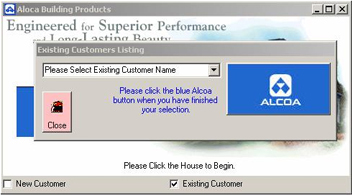 When the user selected either "New Customer" or "Existing Customer", the distributor's database which was tied to Alcoa Corporate database would allow the user to select the customer's personal information as is shown on the next screen shot.