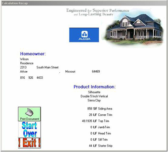 Products, siding type, color selection all could be selected from simple drop down selection boxes that were automatically updated every time that the corporate database was accessed. All data selected was linked to other marketing and sales modules for the selection of Good, Better, Best product selection as well as modules for handling objects, siding type, color selection all could be selected from simple drop down selection boxes that were automatically updated every time that the corporate database was accessed. All data selected was linked to other marketing and sales modules for the selection of Good, Better, Best product selection as well as modules for handling objections, making presentations, return on investment (ROI) calculators etc. Graphic images of products would change to reflect the actual product selected actions, making presentations, return on investment (ROI) calculators etc. Graphic images of products would change to reflect the actual product selected.